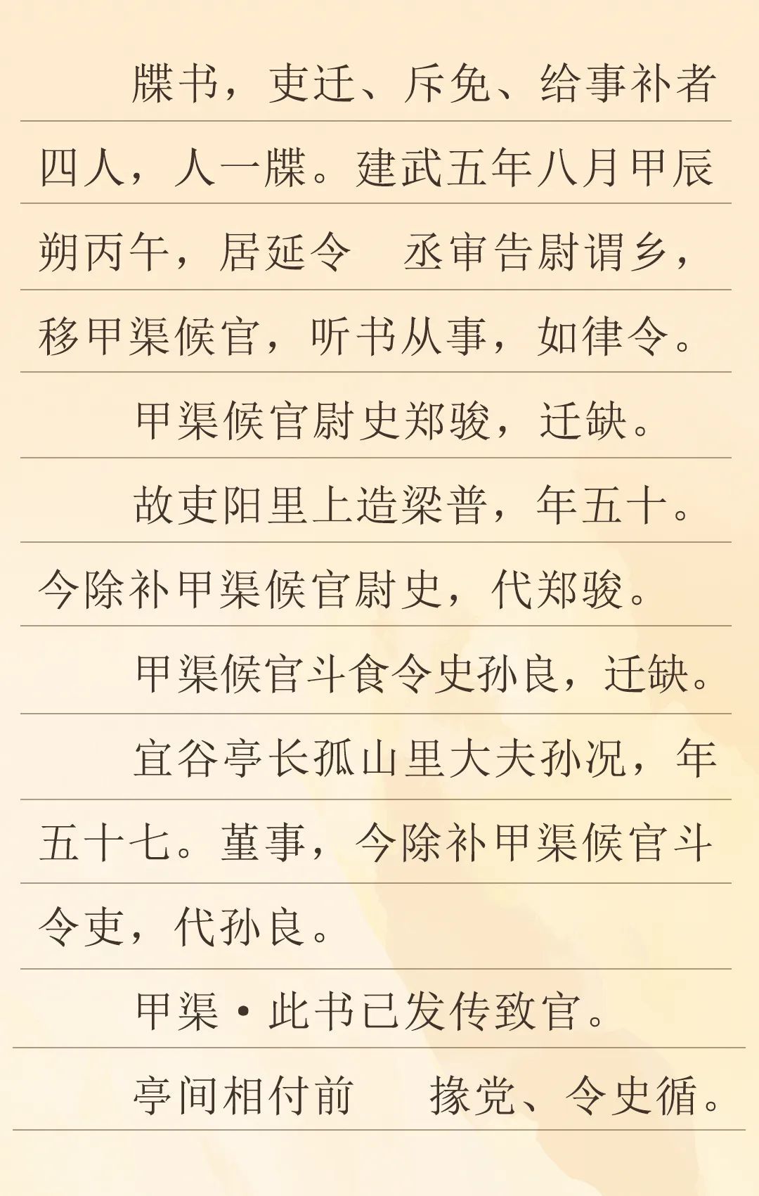 這是一份距今1995年的地方官員任命書。當(dāng)時是東漢建武五年八月,在漢代張掖郡居延邊塞的甲渠候官進(jìn)行了人事調(diào)整,對官吏進(jìn)行了任免。一個是甲渠候官尉史鄭駿升遷,由五十歲的梁普補缺;另一個是甲渠候官斗食令史孫良升遷,由五十七歲的原宜谷亭長孫況代任,其中提到孫況做人低調(diào)、行事嚴(yán)謹(jǐn)(即“謹(jǐn)事”)。這次人事調(diào)整是由居延縣負(fù)責(zé)。