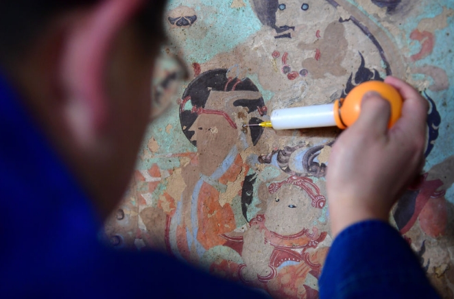 工作人員在修復出現(xiàn)病害的壁畫。記者 杜哲宇 攝