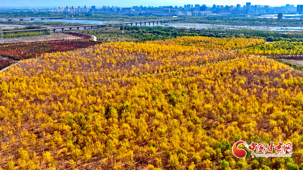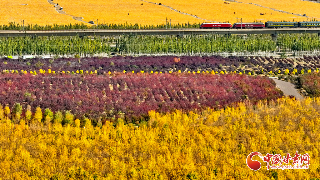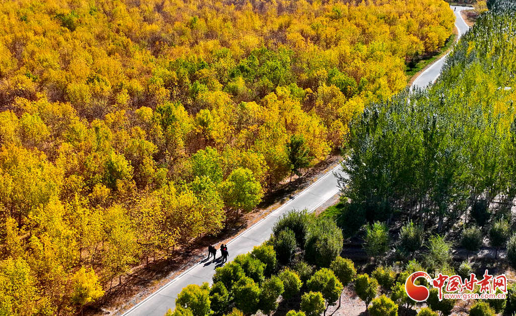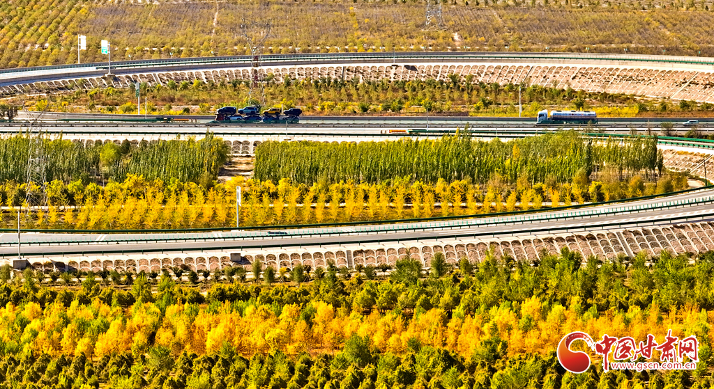 金秋時節(jié),張掖市甘州區(qū)的黑河兩岸,生態(tài)防護(hù)林的樹葉逐漸披上金色與紅色,景色迷人。尤其是那延綿的人工胡楊林景區(qū),金黃一片,層巒疊嶂,美不勝收。蘭新高鐵與連霍高速穿梭于這片林海之中,構(gòu)成了一幅動人的風(fēng)景線。這里的空氣純凈、環(huán)境寧靜、負(fù)氧離子含量豐富,成為了游客和市民休閑觀光的理想之地。