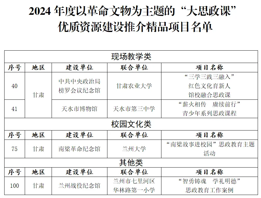 其中,甘肅省4項案例入選。分別是,中共中央政治局榜羅鎮(zhèn)會議紀念館、甘肅農(nóng)業(yè)大學(xué)“三學(xué)三踐三融入”紅色文化育新人館校融合思政課;天水市博物館、天水市第三中學(xué)“薪火相傳 賡續(xù)前行”青少年系列思政課程;南梁革命紀念館、蘭州大學(xué)“南梁故事進校園”思政教育主題活動;蘭州戰(zhàn)役紀念館、蘭州市七里河區(qū)華林路第一小學(xué)“智勇鑄魂 學(xué)禮明德”思政教育工作案例。