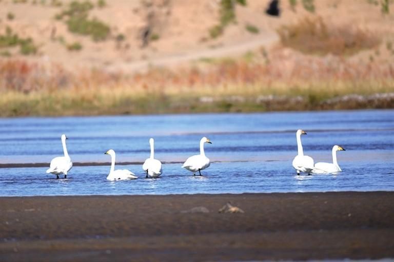近日,高臺縣黑河濕地多次監(jiān)測到大天鵝種群,它們的翩翩降臨,標(biāo)志著天鵝一年一度的越冬之旅正式開啟。 大天鵝是雁形目鴨科天鵝屬鳥類,又稱黃嘴天鵝,全身潔白,僅頭稍沾棕黃色;喙黑色,上喙基部黃色,喙端黑色;跗跖、蹼、爪也為黑色,是國家二級保護(hù)動(dòng)物。天鵝對棲息地的選擇極為苛刻,它們的到來是高臺縣黑河濕地生態(tài)環(huán)境質(zhì)量優(yōu)良的有力證明。