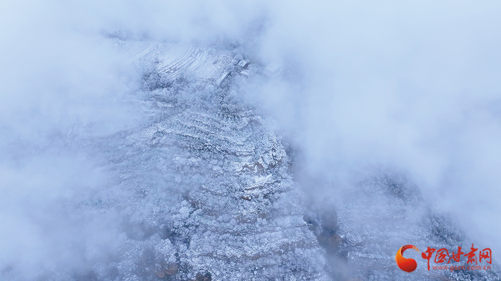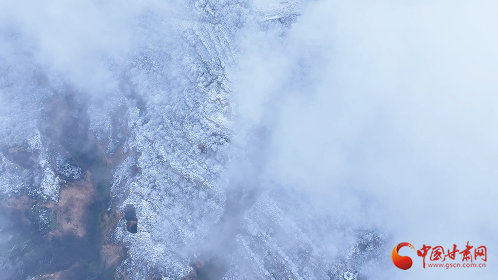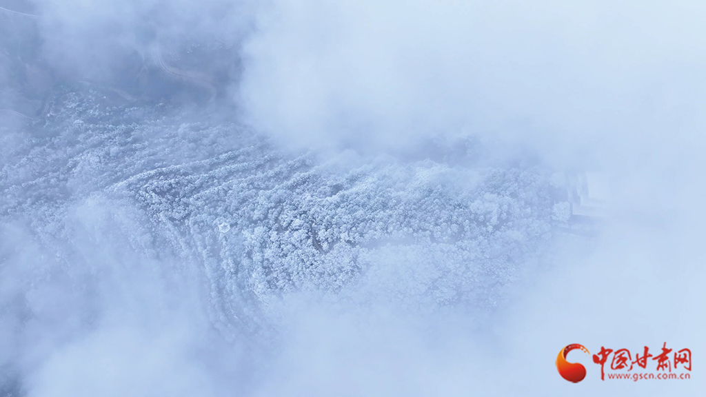 從高空俯瞰,云海之中霧凇景觀蔚為壯觀,連綿起伏的山巒美如仙境??~緲的云霧似輕紗流淌涌動,漫過靜謐的山林,好似一幅如夢似幻的水墨畫卷。