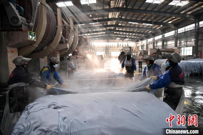 11月22日,甘肅省臨夏回族自治州廣河縣一家皮革企業(yè)的生產(chǎn)車間內(nèi),工作人員整理鞣制后的牛皮。九美旦增 攝