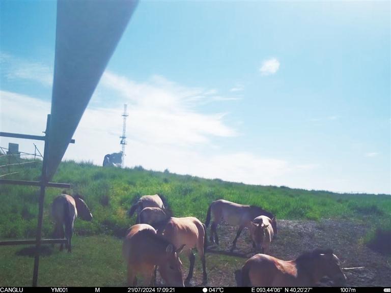 近日,甘肅敦煌西湖國(guó)家級(jí)自然保護(hù)區(qū)管護(hù)中心工作人員整理紅外相機(jī)拍攝畫面時(shí),發(fā)現(xiàn)拍攝到普氏野馬“哺乳”的清晰影像。畫面拍攝于今年7月下旬,有8匹普氏野馬繁殖群正在馬圈灣濕地的飲水泉附近活動(dòng),其中有一匹小馬駒滿足地吸吮著母馬的乳汁。據(jù)監(jiān)測(cè),該小馬駒出生于6月上旬,畫面中約已有一個(gè)半月大小,身體健康,毛色光亮。這個(gè)繁殖群領(lǐng)地范圍主要從馬圈灣西觀景臺(tái)至馬圈灣東高地,該區(qū)域可采食物種類豐富、水源充沛,是適合普氏野馬生活的美麗家園。普氏野馬是國(guó)家一級(jí)重點(diǎn)保護(hù)動(dòng)物,常棲息于山地、草原和荒漠,性機(jī)警、善奔跑。近年來(lái),隨著敦煌西湖保護(hù)區(qū)生態(tài)環(huán)境保護(hù)力度加大,生態(tài)環(huán)境質(zhì)量持續(xù)改善,群眾保護(hù)野生動(dòng)植物的意識(shí)不斷增強(qiáng),使野生動(dòng)物活動(dòng)范圍不斷擴(kuò)大,種群數(shù)量不斷增加。截至目前,敦煌西湖保護(hù)區(qū)內(nèi)普氏野馬種群數(shù)量已達(dá)166匹。