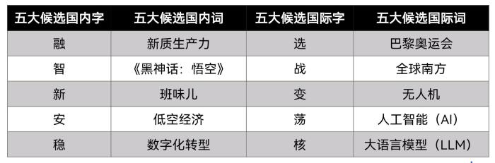 國(guó)內(nèi)字詞前五位分別是“融、智、新、安、穩(wěn)”和“新質(zhì)生產(chǎn)力、《黑神話(huà):悟空》、班味兒、低空經(jīng)濟(jì)、數(shù)字化轉(zhuǎn)型”;國(guó)際字詞前五位分別是“選、戰(zhàn)、變、蕩、核”和“巴黎奧運(yùn)會(huì)、全球南方、無(wú)人機(jī)、人工智能(AI)、大語(yǔ)言模型(LLM)”。