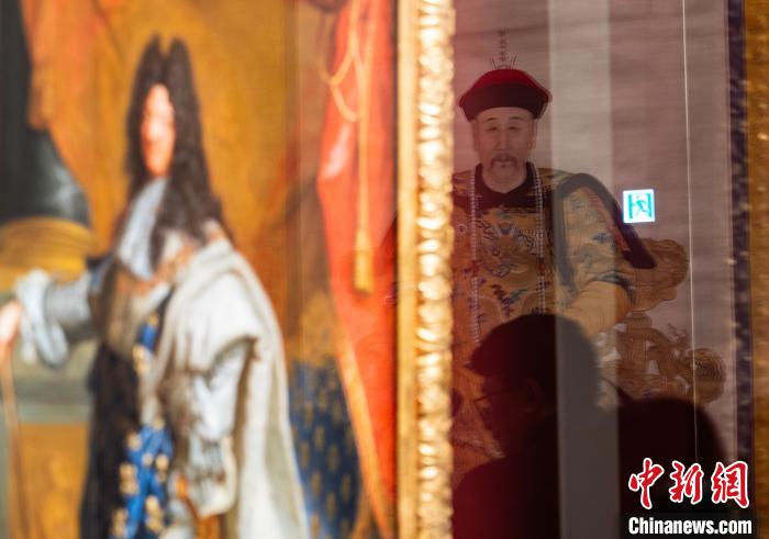 圖為故宮博物院藏《雍正帝朝服像》《康熙帝戎裝像》《孝莊文皇后朝服像》(右一起)和法國(guó)《路易十四肖像》(左一)同廳展示。中新網(wǎng)記者 侯宇 攝