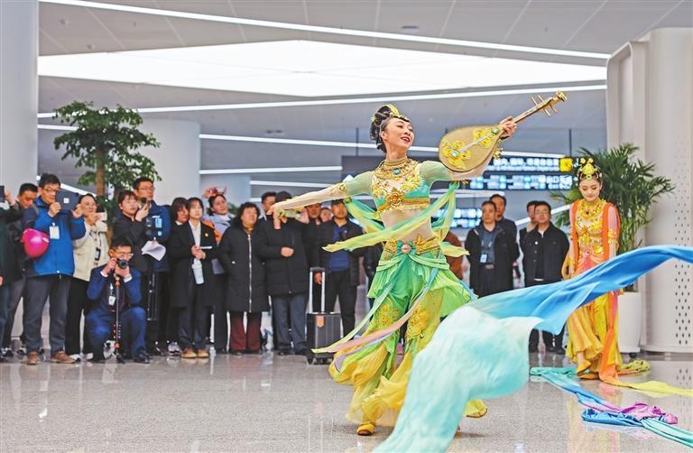 3月20日,在T3航站樓國(guó)內(nèi)到達(dá)層,文藝工作者為旅客表演經(jīng)典舞劇《絲路花雨》片段。