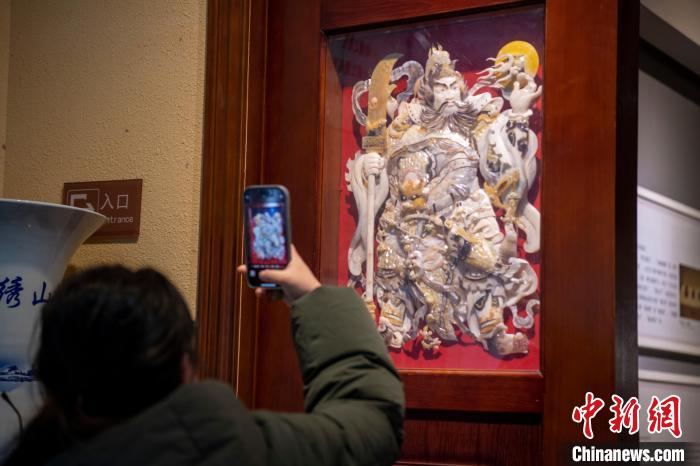 2月3日,游客在廣西北海貝雕博物館拍攝貝雕作品《日月門神》。 陳秋霞 攝
