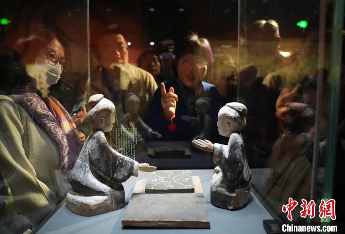 3月30日,觀眾在講解員的引導下欣賞甘肅省博物館藏的西漢彩繪木六博俑。 史春陽攝