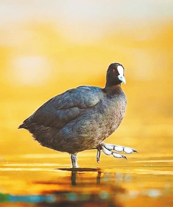 白骨頂又被喚作骨頂雞,卻是鶴類的遠(yuǎn)親。它靜浮水面時,額前一抹象牙白,宛若遺落人間的墨玉鎮(zhèn)紙。這枚額甲實為特化的角質(zhì)層,是為了保護頭部的盔胄?;野咨陌牾肴缪┑匮グ惆洪g,劃開水藻時泛起粼粼波光——這身黑羽配雪蹼的穿搭,竟比時裝周的極簡主義更先鋒。當(dāng)它們列隊掠過蘆葦蕩,水淼勾勒的剪影里,仿佛在繪制著秋天的信箋。
