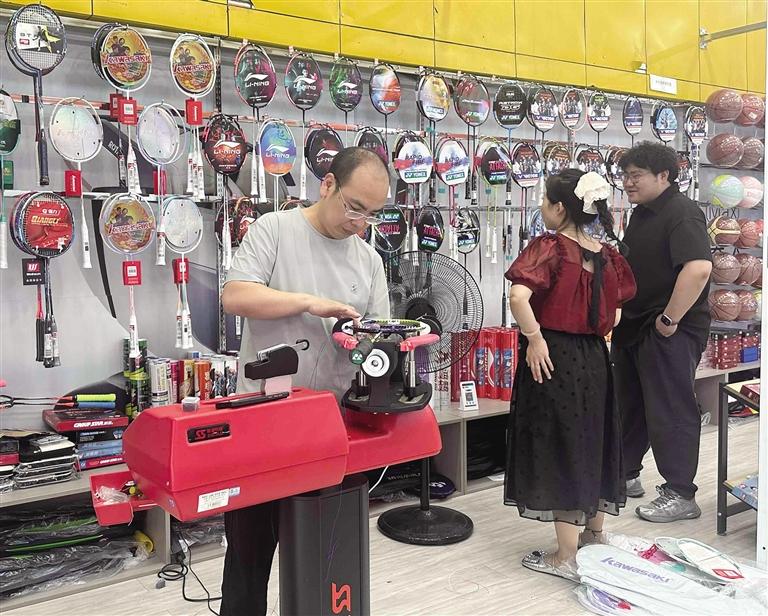 不僅如此,運(yùn)動用品銷售也迎來小高峰。瑞德摩爾太平洋商場內(nèi)的健雄體育用品店內(nèi),老板正忙著給羽毛球空拍穿線。“我們不僅有現(xiàn)成的羽毛球拍,還可以根據(jù)客戶的需求給空拍穿線。”該店老板介紹,羽毛球拍網(wǎng)線價位30至100元不等,購線還可免手工費(fèi)。羽毛球初學(xué)者一般都會買成品拍自己在家練習(xí),而一些技術(shù)較好的顧客除了會選擇品質(zhì)較好的空拍,還會現(xiàn)場選線拉網(wǎng)定制屬于自己的球拍。“暑假以來,店內(nèi)羽毛球拍銷量大增,穿線需求也逐漸增多,周末從早忙到晚,每半小時穿一個球拍,最多一天穿24個,排隊(duì)等候已成常態(tài)。”此外,不少運(yùn)動品牌也順勢推出促銷活動,吸引消費(fèi)者選購。