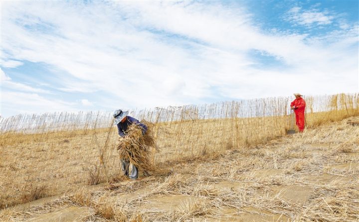 近日,在金塔縣黑河中游防沙治沙林草綜合治理項目固沙現(xiàn)場,工人在起伏的沙丘上或鋪設(shè)草方格沙障,或搭建高立式沙障,努力為沙漠邊緣的綠洲、城市筑起屏障。