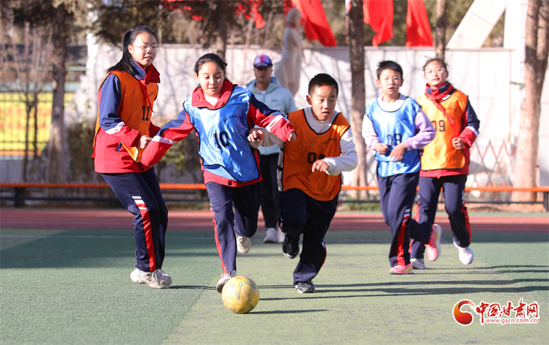 11月11日,在張掖市民樂縣洪水小學的足球場上,學生們在進行足球訓練。