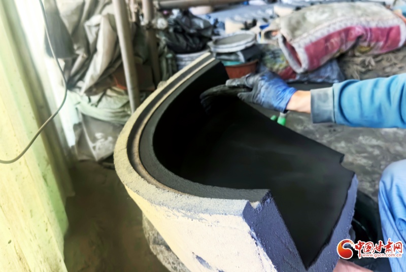 如果說(shuō)兌沙是技藝的根基,那“制模”便是它的靈魂。團(tuán)沙成坯、旋出弧度、拍實(shí)定型、分塊剪下,再用刻刀一點(diǎn)點(diǎn)勾勒出內(nèi)壁的紋路,接著在模具上精雕出藏八寶、龍紋等花紋,最后將外殼合在內(nèi)模上、抹平縫隙、層層加固——一套模具經(jīng)歷這些工序才能慢慢成型,但是澆筑后便會(huì)碎毀。