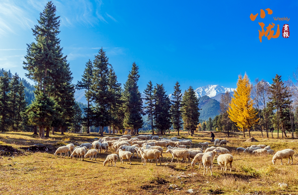 大地披上了金色的盛裝,悠然自得的羊群、五彩的樹木,與遠處的雪山和湛藍的天空、潔白的云朵,共同繪制成一幅初冬最亮麗的風景畫。