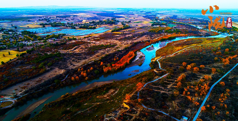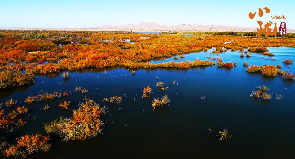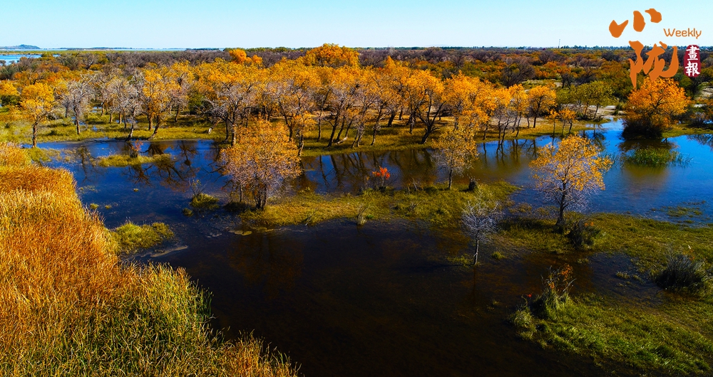 金色胡楊在陽光下泛著溫暖光澤,斑斕絢麗的蘆葦如金色絲帶點綴荒漠,與碧綠河水、湛藍(lán)天空構(gòu)成濃墨重彩的秋日圖景。