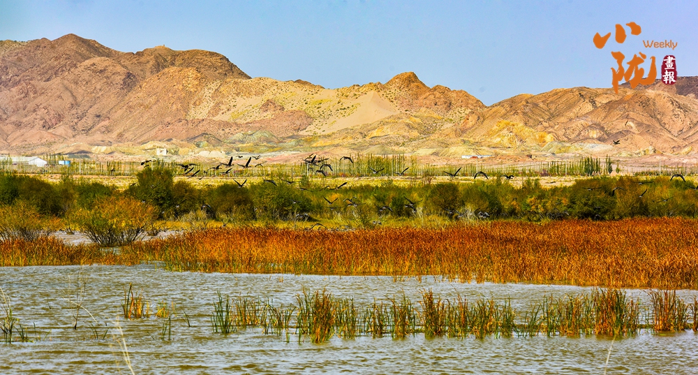 水草搖曳、波光粼粼、候鳥翻飛,湖泊與沙丘共存,藍(lán)天與碧水相接,集大漠戈壁、蘆葦、候鳥、湖泊于一體,構(gòu)成了一道獨特的自然景觀。