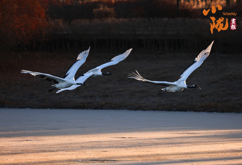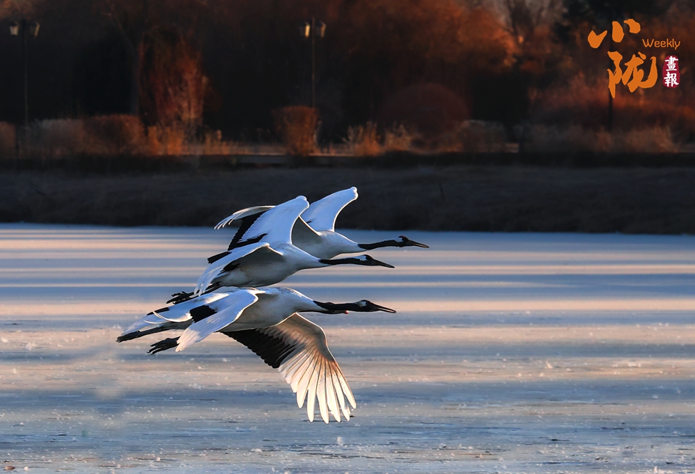 陽(yáng)光灑在冰面上,晶瑩閃亮。十多只丹頂鶴翩翩起舞,飄逸的飛翔,優(yōu)雅的舞姿,輕盈的腳步,用最純粹的姿態(tài)演繹著生命的禮贊。