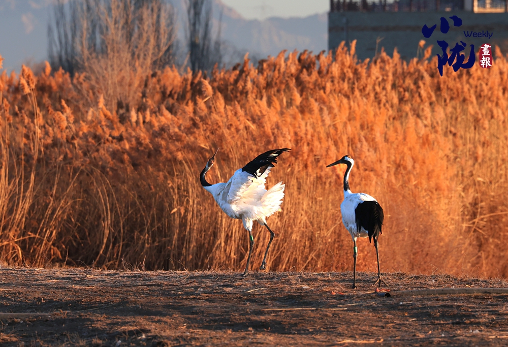丹頂鶴時(shí)而凌空飛舞,時(shí)而散步、覓食,穿梭在金黃的蘆葦間。
