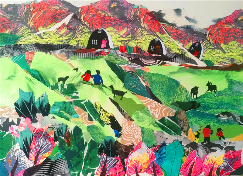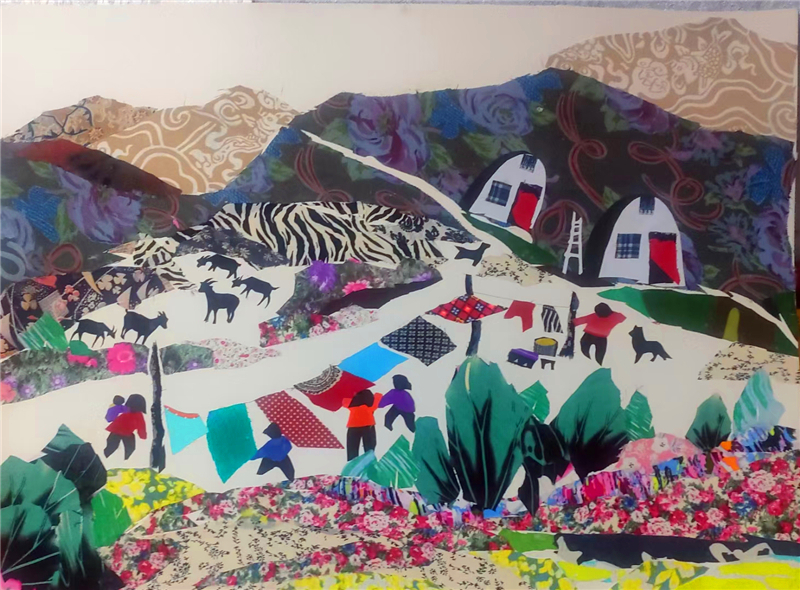 裁剪環(huán)節(jié)更見(jiàn)功力。她以“銳利”之心駕馭剪刀,根據(jù)畫(huà)面需求將碎布剪成不同形狀,有的需棱角分明,有的要圓潤(rùn)柔和。粘貼時(shí),她摒棄簡(jiǎn)單的粘合方式,采用傳統(tǒng)縫補(bǔ)與現(xiàn)代鑲嵌相結(jié)合的技法,讓布料與底板緊密貼合,既保證了作品的耐久性,又營(yíng)造出自然的浮雕感。在《黃土風(fēng)情》布貼畫(huà)中,她用層層疊疊的碎布表現(xiàn)黃土高原的溝壑縱橫,用深淺不一的色塊勾勒窯洞的錯(cuò)落有致,指尖翻飛間,碎布頭便有了筋骨與神韻。