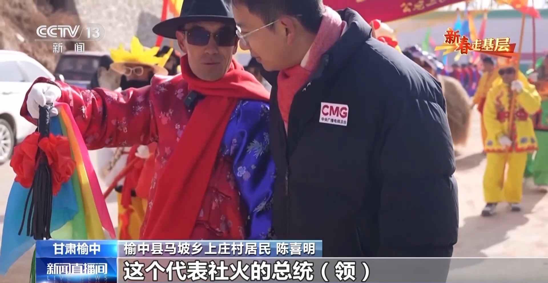榆中縣馬坡鄉(xiāng)上莊村居民 陳喜明:這個代表社火的總統(tǒng)領,是給我們引場子的,社火就是把大家召集到一起,前段時間這里遭災,搞個社火把大家的精神提一提。