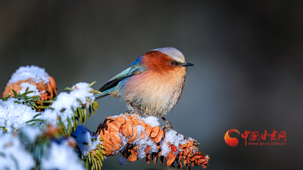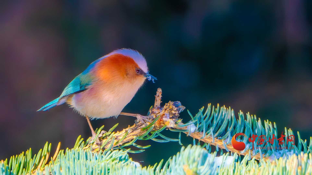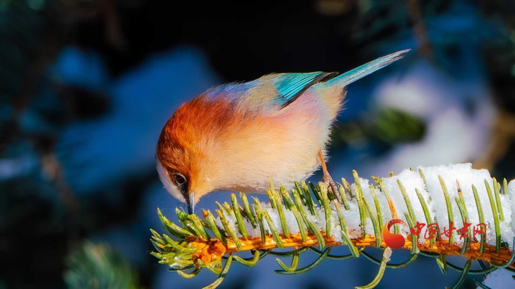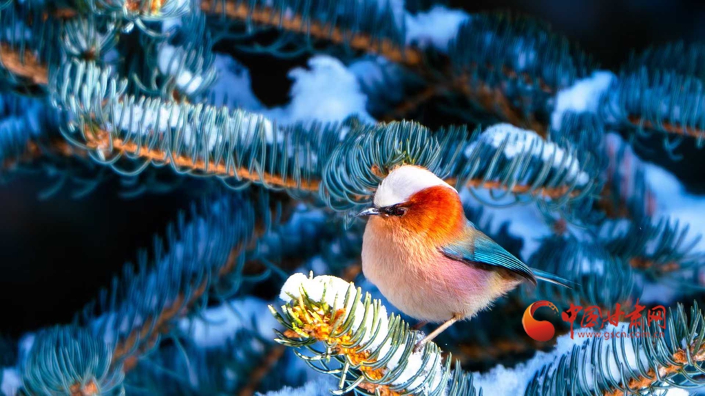 這群被譽(yù)為“祁連山精靈”的小鳥,頭頂雪白羽冠蓬松如絨,仿佛戴上了一頂天然的小絨帽,棕紅面頰溫潤(rùn)似玉,在陽(yáng)光下泛著柔和的光澤,藍(lán)綠背羽如同上好的寶石,在雪色映襯下泛著金屬般的質(zhì)感。淡粉與橙白相間的腹羽柔和雅致,層次分明,在純白背景的映襯下,形成強(qiáng)烈而和諧的視覺(jué)碰撞,它們或亭亭立于覆雪松枝,或靈巧穿梭于松針間隙,更有靈動(dòng)的個(gè)體俯身探喙,啄取松針縫隙里的昆蟲,一聲輕脆的啄擊,劃破林間的清寂,卻更顯山野幽靜,羽翼輕振間,將“雪中覓食”的鮮活圖景永久定格。