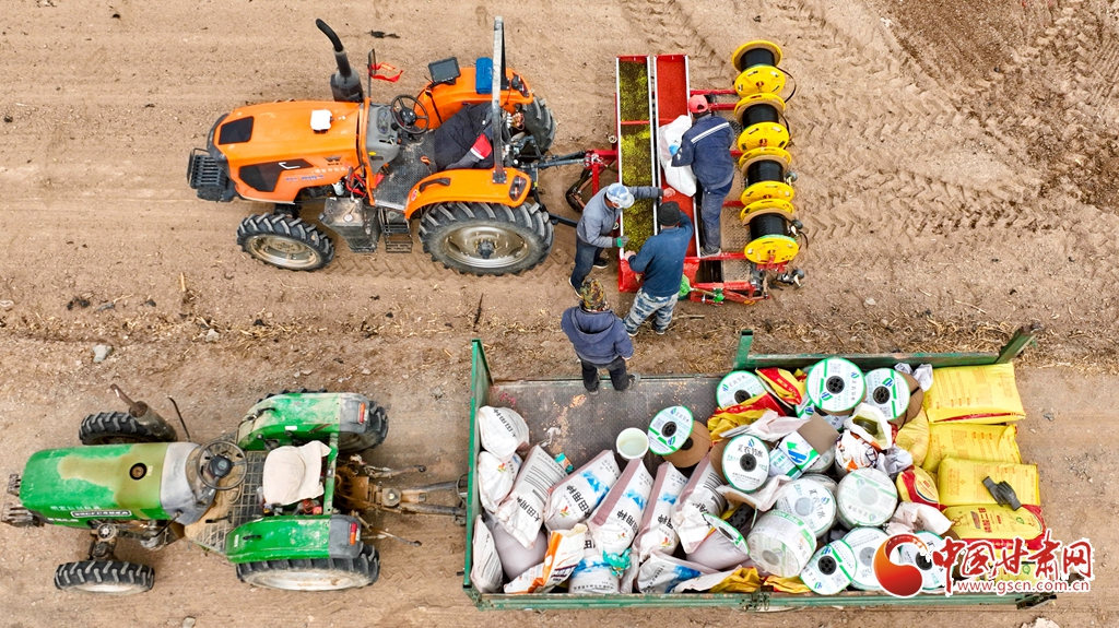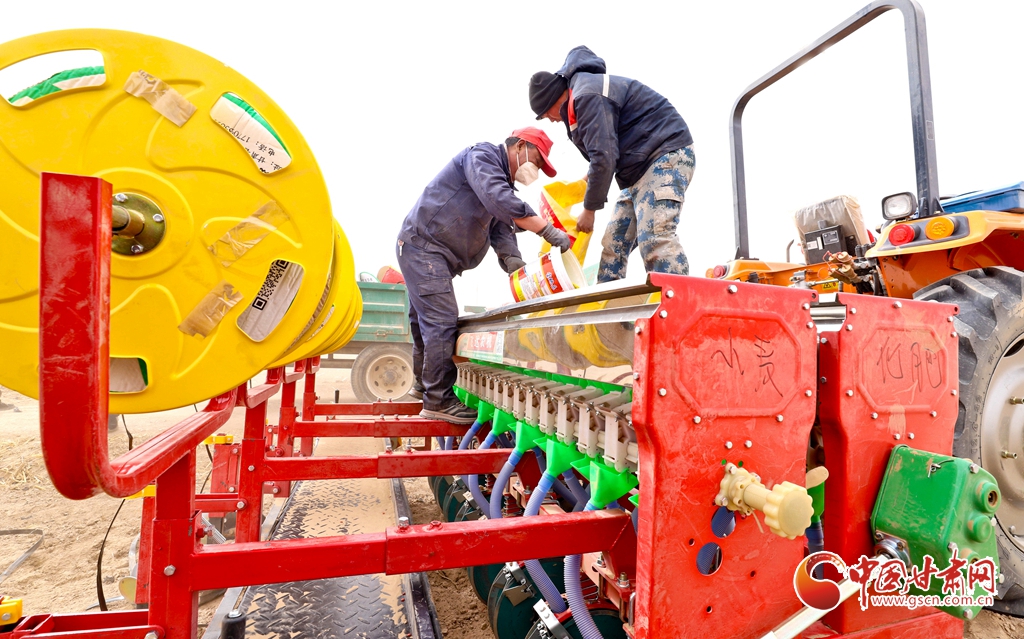 3月12日,張掖市高臺縣巷道鎮(zhèn)殷家橋村綠色高效小麥種植基地上,農(nóng)戶們正在將小麥種子、有機(jī)肥料投入播種一體機(jī)。